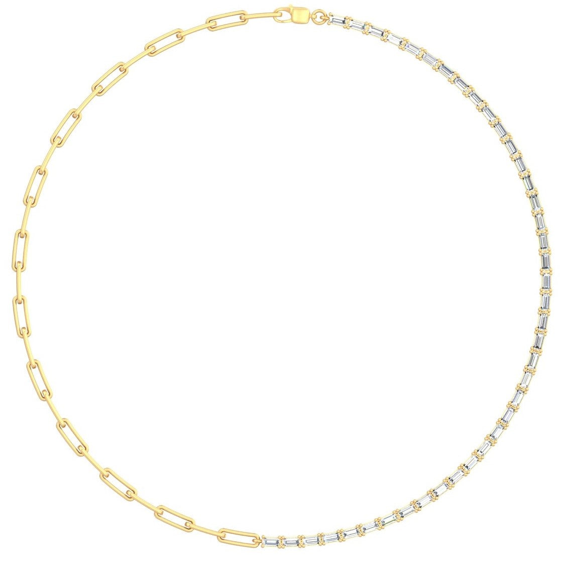 Elevate your elegance with our 14k Gold Paperclip and Emerald Diamond Tennis Necklace. This stunning piece blends the bold. chunky sophistication of a gold paperclip chain with the sleek sparkle of lab-created emerald-cut diamonds set in a radiant tennis chain section. Available in 14k yellow gold or 14k white gold. it combines sustainable luxury with contemporary brilliance. Handcrafted in Naples by Sakaris Jewelers. this necklace is perfect for everyday wear. layering. or special occasions. offering a perfect balance of modern edge and timeless glamour. Shine with its striking. multifaceted charm.