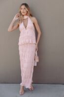 Turn heads with the Zafira Textured Halter Top in Pink. designed for the confident woman who knows her worth. The flattering halter tie closure and plunging v-neckline create an effortlessly chic silhouette that transitions seamlessly from brunch dates to evening parties.